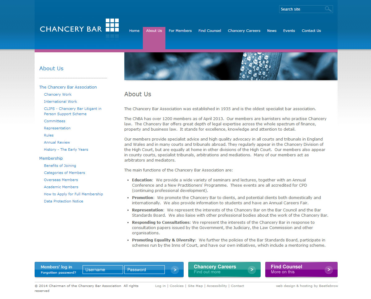 The CHBA runs conferences, seminars and events, both paid for and free, and maintains a membership of around 1200 barristers who practice Chancery Law both domestically and overseas. It needed a way to keep in touch with its members through a modern web site, which could accept bookings and payments, subscriptions and general requests, while at the same time making some of its member information available to, and searchable by, the general public who might be in need of a barrister specialising in Chancery Law.