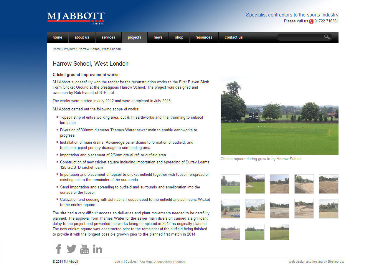 Throughout the design and build process, we have remained response to requests and comments, and have extended the specifications of the web application as the build was underway in order to give MJ Abbott everything they needed. This includes a projects portfolio which allows them to add projects for display under as many of the nine project categories as are relevant (for example, a project may involve land drainage, water management and sports turf), and highlight important or high profile projects both within the portfolio section and on the web site homepage.