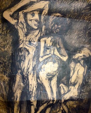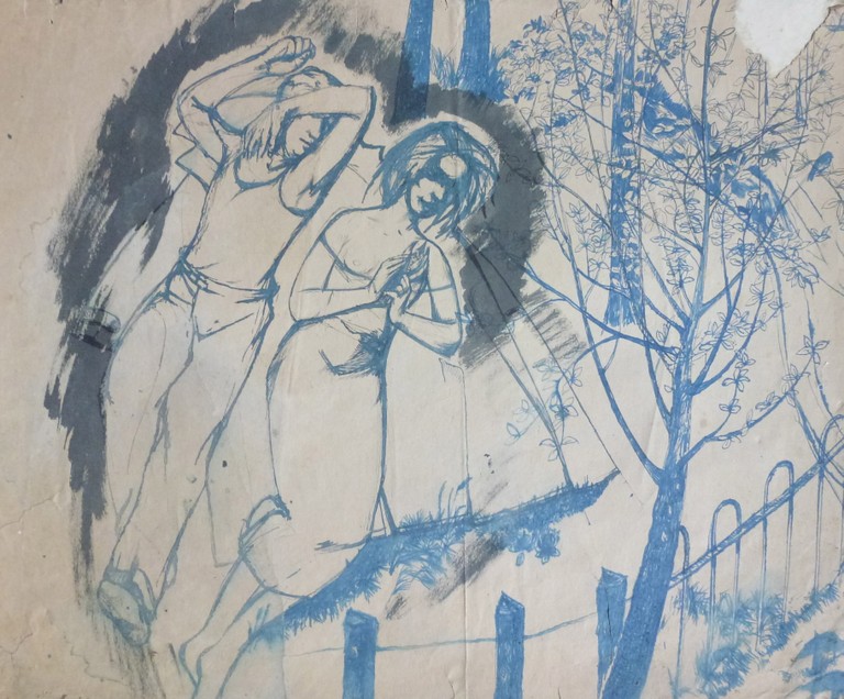 Was he preoccupied with his own mortality? Did he draw his own death? His last work, a macabre ink drawing of the ‘dead family’’ is raw and harsh, the marks, or lines, are scored and slashed, features and proportions crude. It can be contrasted with a fragment of sketch for a painting (now lost) of lovers in the park, in a lyrical ‘Chagall-esque’ composition (roughly ten years earlier, 1953/4).