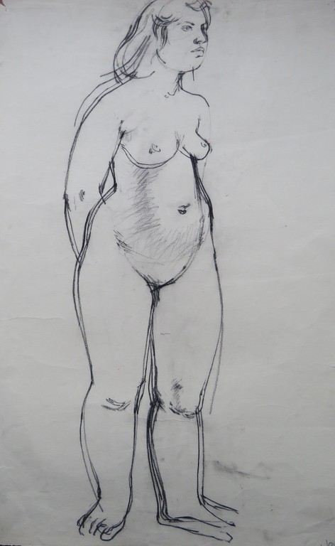 Above are some of my Janie Alston life drawings from her time at Glasgow School of Art during the 1950s. They show the influence of the teaching at GSA. William Drummond Bone’s principles; encouragement of using materials like charcoal, red conte, ink to free; space filling; finding the form (before details); looking at the tension in the form, the taut line and the slack line…