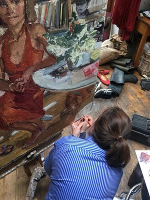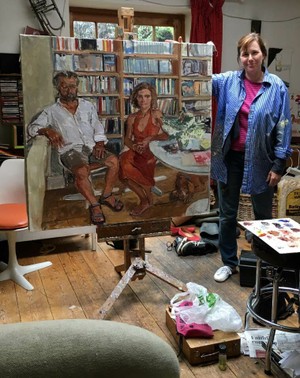 ‘Picture perfect: omg I have A Susan McFarlane!!! I commissioned a portrait of Vincent from this dear friend and phenomenal artist, for him to experience the process of being depicted, being on the other side of the canvas, without the final product in mind. But Susan’s particularly keen on painting couples - how their relationships manifest on the canvas - so, er, I’m in it too. What an extraordinary experience: to see oneself through someone else’s eyes; to see how my husband (oo I still feel weird saying that?!?) and I naturally fell into our positions, with an element of contact (after 5 weeks at sea together, I had wondered how this would pan out...); to see Susan manipulate the paint - conjure up so many colours from the 3 primaries; approach her subject like a bird, head side to side, in a fluid choreography of feinting and dipping with her long brushes; to muse on artists and creativity; to have to sit still for FIVE days. The flowers were on the turn, and I wanted them slightly degraded to give a sense of impermanence to the picture; to avoid the feeling that this is a fixed point in time - but they died, uncompromisingly, so have been resuscitated here in paint. So, in a very short time, this has materialised, complete with Scoots, and pics of the kids on the shelves. A sheer privilege.’ Vivienne Golding