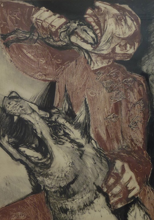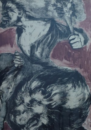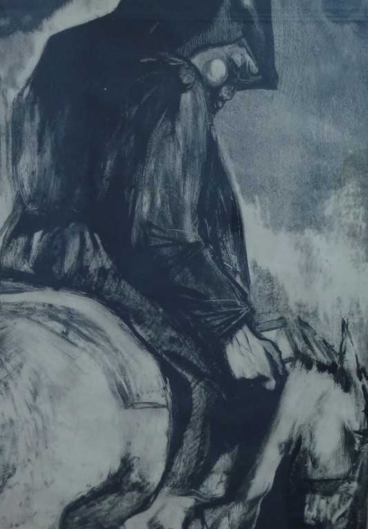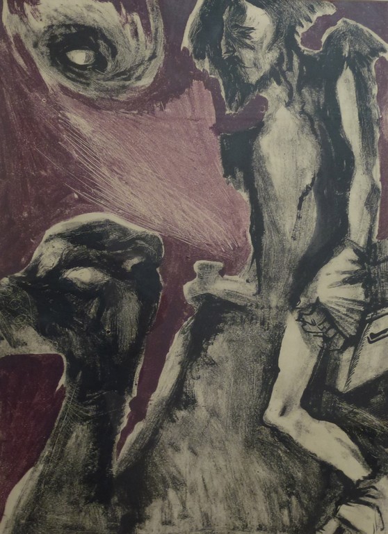 Gavin Alston created this most impressive set of monotypes for his exhibition at The Grail Gallery in 1963, prior to his death. For me they represent the summit of his work. They are, in my opinion, the most 'contemporary' i.e. seem to show the influence of Robert Colquhoun and Graham Sutherland, contemporaneous artists. Strong draughtsmanship, emotional intensity and imaginative composition are fused successfully in this powerful series of works.