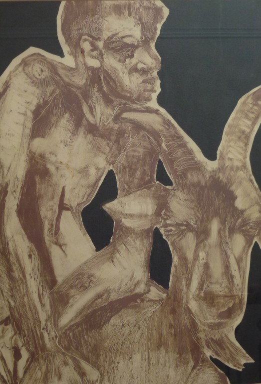 Among his few paintings here, there is a vigorous, dramatic Crucifixion, but the four oils forming an incomplete series of the Plagues of Egypt are much less impressive. Colour, for some reason, weakens his work, as does the medium of oil paint. His strength lies in line, in boldness of gesture and silhouette. His talent is a public one, I would say, and he likes to work on a large scale. It is not surprising that his drawings have been used to illustrate a series of religious programmes on STV. They are also on show but they pale beside his splendid monotypes.