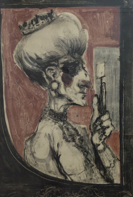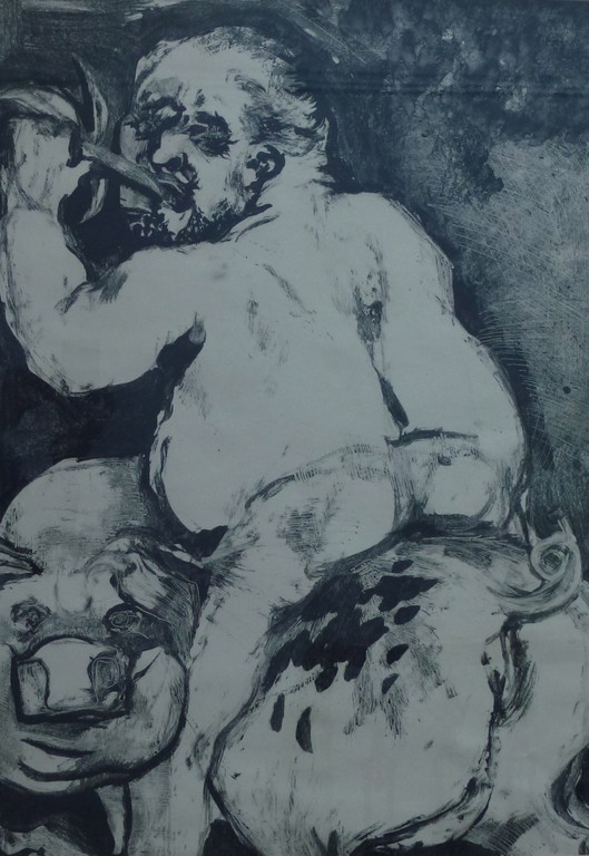Mr Alston divides his work into three sections, of which the eight monotypes on the theme of ‘The Seven Deadly Sins’ is by far the most important, though his six unframed, ink drawings of The Last Supper are most striking and effective. The monotypes of the ‘Seven Deadly Sins and the Devil’ (who drives the team) are extremely powerful and imaginative creations. Gavin Alston’s work is bold incisive and strongly emotional in its impact. The Teutonic influence of Breughel and Bosch, is paramount, but absorbed and digested.